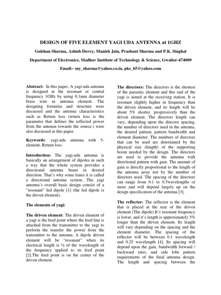 DESIGN OF FIVE ELEMENT YAGI UDA ANTENNA at 1GHZ | Antenna (Radio) | Electromagnetism